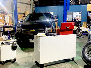 当社では、アメリカ車に多く履かれている大口径ホイールやタイヤも交換が可能なタイヤチェンジャーとバランサーを自社設備しています。